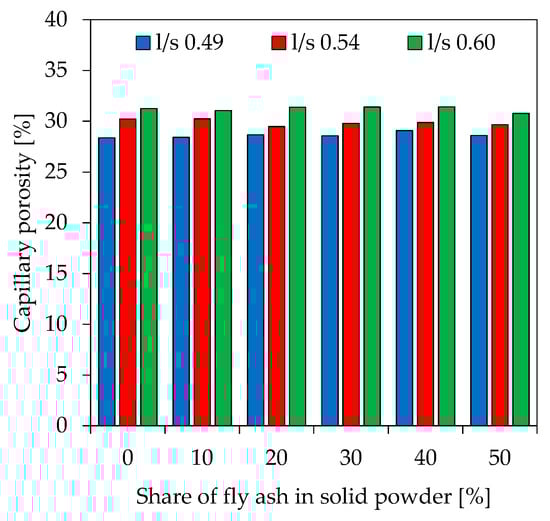 The capillary porosity resulting from water adsorption tests (Figure 9) reveal that the effect of increasing l/s ratios on total porosity is stronger than the one induced by higher fly ash contents. Capillary porosity for l/s 0.49 is between 28.4% and 29.1%, for l/s 0.54 between 29.5% and 30.2% and for l/s 0.60 between 30.8% and 31.4%, respectively. Table 4 shows the total porosity measured by MIP and the total capillary porosity measured from water absorption tests. Apart from FA50.60, the total capillary porosity is significantly higher than MIP porosity.