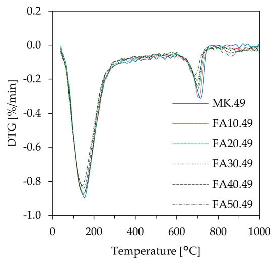 Differential thermogravimetric (DTG) curves of geopolymers (l/s 0.49).