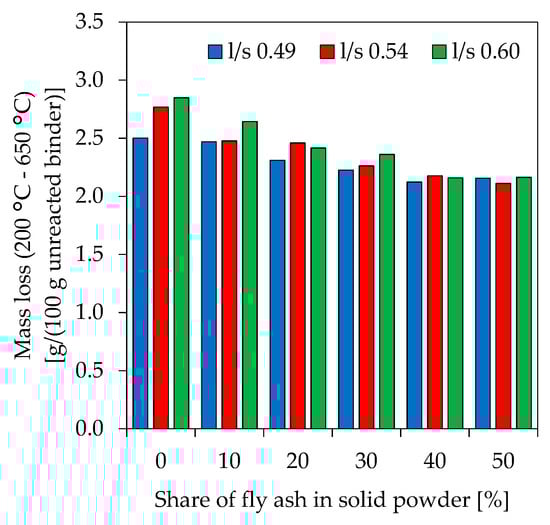 Thermogravimetric analysis-differential scanning calorimeter (TGA-DSC) of geopolymer powder samples and the evaluation of the measurements in the range 200 °C–650 °C (see Figure 13) can be an indication of the amount of newly formed geopolymer gel. The results show that less water is bound at higher fly ash contents and increasing l/s ratios. In agreement with the reactivity of the fly ash as well as the overall amount of reactive phases, higher amounts of fly ash result in lower amounts of geopolymer gel and, therefore, less structural and/or chemically bound water. The effect of the l/s ratio can be explained by higher amounts of reactive Si from potassium silicate solution, which increase of the total amount of geopolymer gel. However, in the TGA-DSC measurements different processes may overlap. This complicates the allocation of the respective mass losses to certain processes chemically and physically conditioned as well as the temperature range at which those processes take place. Furthermore, the information given in literature differs greatly with regard to the cause of mass loss and the respective temperature range (Table 5).