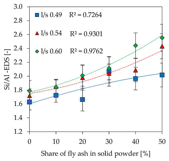 The total amount of Si and Al results from the chemical composition of used materials, where the amorphous Si and Al is taken from Table 2. All graphs are presented including trendlines (polynomial functions of degree 2). Si/Al-EDS (Figure 12) shows an increase in the ratios for higher fly ash contents and higher amounts of potassium silicate solution in geopolymers. This is likely due to the lower amount of Al from metakaolin, as the mass percentage of the raw material decreases at higher substitution rates of fly ash and higher l/s ratios. In this context, Si/Al-EDS for l/s 0.49 shows a slightly different behavior, a convex instead of concave trendline, but exhibiting also a much lower coefficient of determination. Experimental Si/Al-EDS values are higher than Si/Al ratios calculated from the amorphous content of the raw materials with (Si/Al-MK/FA/S) and without fly ash (Si/Al-MK/S). The highest values for Si/Al-MK/S-total, higher than the measured and other calculated Si/Al ratios, results from the consideration of the total content of oxides. This, in the case of metakaolin, causes the Si value to rise sharply since the used metakaolin has a high content of crystalline quartz. In other words, measured values are in line with the theoretical cases and agree with results from reactivity of the precursors.