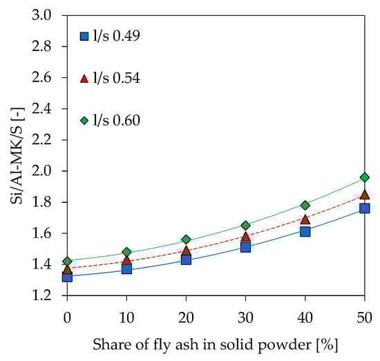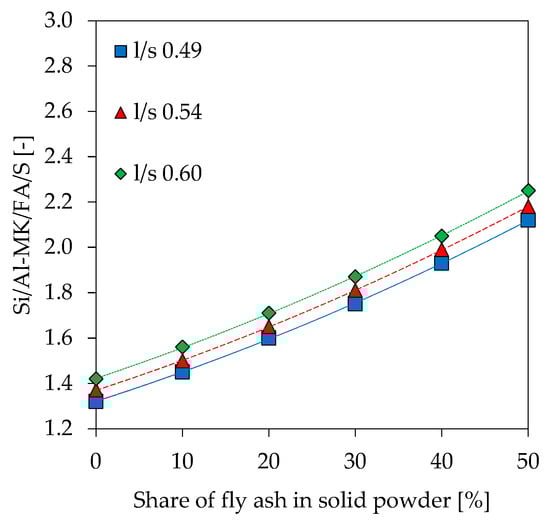 The effect of fly ash content and l/s ratio on compressive strength (see Figure 6) is very complex and requires the consideration of many contributing factors. The influence of reactive Al on early strength has already briefly been mentioned before. In this context, the Si/Al ratio of the geopolymer network has a decisive effect as higher ratios up to a certain degree usually lead to a more homogenous and denser matrix [4]. Bonds between Si species in the alumosilicate network are stronger than those between Si and Al [61] and therefore result in a higher strength of the network as well [5,6]. Literature reports values of 2.5 [62], 2.3 [63], 2.0 [64], 1.9 [5], [65], 1.7 [66], 1.7 to 1.9 [4] as well as 1.8 to 2.2 [67] as the optimal Si/Al ratios for metakaolin based geopolymers. The deviating values can be explained by the different specimen ages at the day of testing, as the geopolymer is initially characterized by an aluminum richer matrix and therefore lower Si/Al ratios [24]. Deviating solids contents in the formulations can also superimpose the influence of the Si/Al ratio [65].