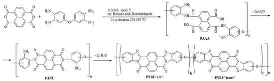 Ladder and semi-ladder polynaphthoylenebenzimidazoles (PNBI) based on aromatic tetraamines and 1,4,5,8-naphthalenetetracarboxylic acid dianhydride have unique thermal, heat- and fire-resistant properties among all organic polymers. Technologies for obtaining prominent fibers known as BBB (polymer based on 1,4,5,8-naphthalenetetracarboxylic acid dianhydride and 3,3’-diaminobenzidine), BBL (polymer based on 1,4,5,8-naphthalenetetracarboxylic acid dianhydride and 1,2,4,5-tetraaminobenzene) and "Lola" from PNBI solutions in sulfuric acid were developed in 1960s and 1970s both in the United States and the Soviet Union [1,2,3,4,5]. “Lola” fiber is based on PNBI polymer synthesized from 1,4,5,8-naphthalenetetracarboxylic acid dianhydride and 3,3’,4,4’-tetraaminodiphenyl ether in polyphosphoric acid (PPA). The obtained from PPA polymer is soluble in 98% sulfuric acid and can be spun through wet spinning process into water-sulfuric acid coagulation bath. Then fibers are subjected to washing and thermal stretching. A modern modification of PNBI fiber (“Lola-Modern” or “Lola-M”) is obtained from a pre-polymer solution in N-methyl-2-pyrrolidone (NMP). PNBI synthesis was usually performed in one-step polycondensation in polyphosphoric acid at 180–200 °C for 8–10 h. That process required special acid-resistant equipment, was not energy-efficient and produced a lot of acidic wastes. Despite these facts, a pilot production of "Lola" fiber reached one ton per year but ceased with collapse of the USSR. In current work the pre-polymers for "Lola-M" fiber production are synthesized in environment friendly and energy-efficient process from 3,3′,4,4′-tetraaminodiphenyl ether and 1,4,5,8-naphthalenetetracarboxylic acid dianhydride in NMP and used for fiber production. Pre-polymer fibers are converted to semi-ladder structure by heat treatment at 250–350 °C as shown in Figure 1.