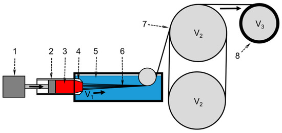 Laboratory stand scheme for wet spinning. 1—engine; 2—100 mL metallic syringe; 3—dope; 4—multifilament spinneret with a die diameter of 80 µm; 5—coagulation bath at 25 °C; 6—solution jets/yarn; 7—winding roller; 8—winding spool. Variable V1 is a linear flow speed from the spinneret and V2 is a winding speed. V2 is equal to V3.