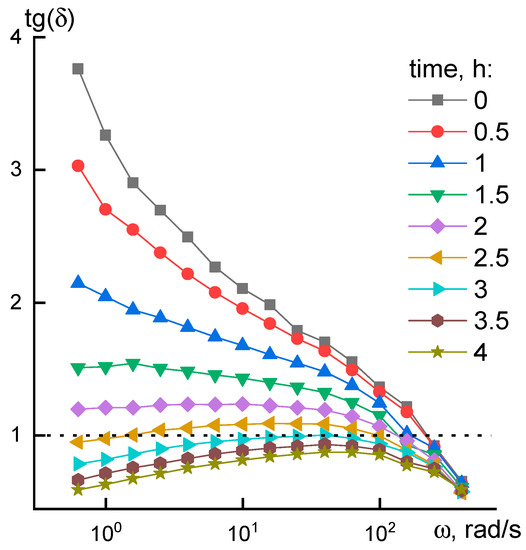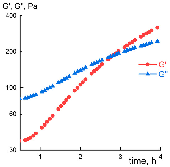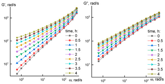 During the measurement, a frequency scanning of the viscoelastic characteristics G’ and G’’ was periodically performed to obtain frequency dependences. Frequency dependences for G’ and G’’ at different heating time are shown in Figure 4.