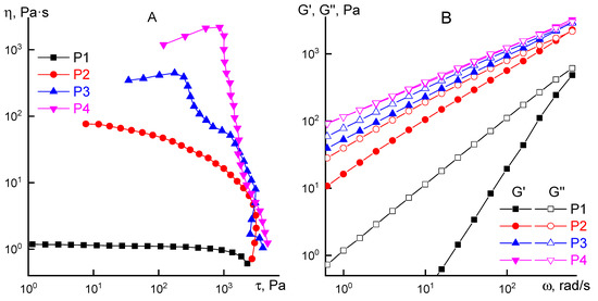 Similar experiment was conducted with P1 solution, which is a viscoelastic liquid with frequency dependency slopes of elastic and loss moduli to be 1 and 2 correspondingly. Keeping P1 solution at 70 °C leads to a molecular weight increase and P2 solution formation with higher viscosity, and a presence of a line corresponded to the initial Newtonian viscosity, unlike P3 and P4 solutions. As a result, two groups of solutions with different concentrations, viscoelastic properties and molecular weights of the same polymer were obtained. Flow curves and frequency dependences of the elastic and loss moduli are shown in Figure 6 for all four samples. Additional G’ and G’’ data for P3 and P4 solutions is shown in Figure S1 (Supplementary Materials).