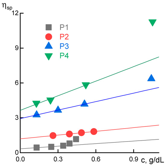 For quick assessment of the molecular weight change with time, diluted solutions of P1–P4 samples were prepared and intrinsic viscosity was estimated. The reduced viscosity vs. concentration dependences with extrapolation to zero concentration are shown in Figure 7.