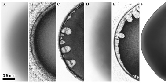 The selection of an appropriate coagulant plays very important role in fiber spinning because it controls the structure and morphology of the obtained fibers [7,8,9] and films [10]. Morphology evolution of solution droplet surrounded by a coagulant was studied (modeling the jet/fiber cross-section) through microscopic methods. Thickness of the droplet was ~0.1 mm and its average diameter was ~1.5 mm. The observation of polymer solution-coagulant interaction was carried out using the Biomed 6 PO microscope (Biomed, Moscow, Russia). Tests for all coagulants were performed at 25 °C.