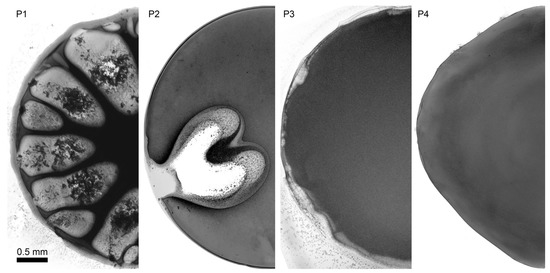 By choosing the most optimal coagulant based on ternary mixture it becomes possible to analyze the coagulation process for solutions after annealing, which leads to changes in polymer molecular weight and rheological properties. Microscopy images of P1–P4 solution droplet coagulation by a coagulant EtOH/H2O/NMP (20/10/70) are shown in Figure 9.