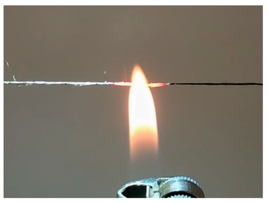 It is necessary to underline thus obtained pre-polymer fibers are a subject for further treatment in order to proceed polymer cyclization and thermal stretching. That is why the thermal treatment of P4 fibers was performed at 350 °C for 4 h in the oven in argon atmosphere and flammability test was conducted. In open flame a complex fiber glows red, does not melt, does not burn and does not smolder when taken out of the flame (Figure 11).