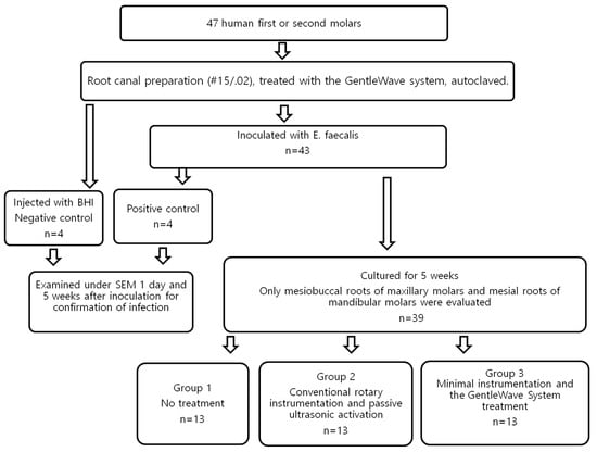 - Group 1—No treatment (n = 13): Teeth in the control group did not undergo any endodontic treatment after inoculation with E. faecalis.