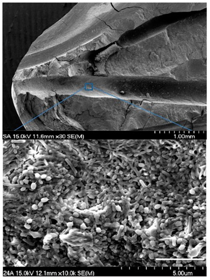 Representative SEM images of the apical-third region from the molars inoculated with E. faecalis (Upper, 30× magnification), randomly selected with apical-third region (Lower, 10,000× magnification) in positive Control group.