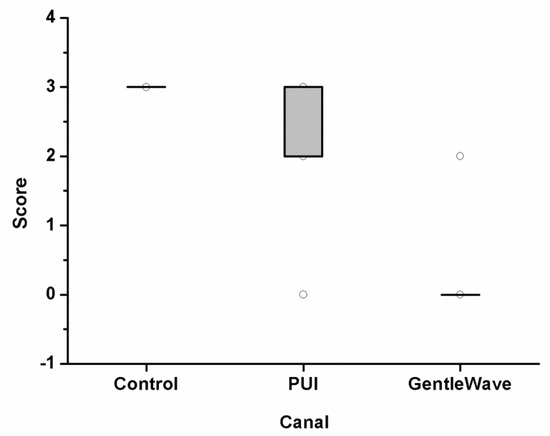 The level of biofilm attachment scores from all the apical sections and the two independent evaluators for the 39 molars left untreated (Group 1) or treated with passive ultrasonic activation (Group 2) or treated with the GentleWave System (Group 3). The modified scores utilized were—Score 0: no bacteria; Score 1: sparse and detached bacteria; Score 2: well defined biofilm (small colonies, <50% of the canal wall covered); and Score 3: well defined biofilm (large colonies, >50% of the canal wall covered). The average scores analyzed for the canals between Group 2 and Group 3 were statistically different (p < 0.001).