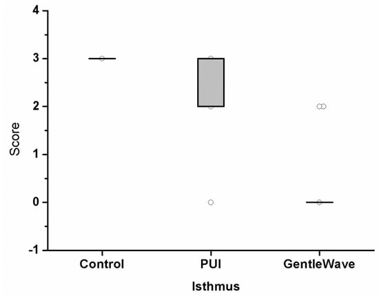 The level of biofilm attachment scores from three independent evaluators for 39 molars in the isthmus region. The samples were either untreated (Group 1), treated with passive ultrasonic activation system (Group 2), or treated with the GentleWave system (Group 3). The modified scores utilized were—Score 0: no bacteria; Score 1: sparse and detached bacteria; Score 2: well defined biofilm (small colonies, <50% of the canal wall covered); and Score 3: well defined biofilm (large colonies, >50% of the canal wall covered). The average scores analyzed for the canals between Group 2 and Group 3 were statistically different (p < 0.001).