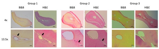 Approximately 936 sections (39 molars × 24 sections/root) stained with H&E or modified B&B were evaluated for the three treatment groups. For quantification purposes, a modified four-score scale system was utilized [2]. The accuracy of the bacterial staining method was tested [22]. The canals and the corresponding sections of each root were thoroughly examined by two independent, trained, and blinded evaluators, including an experienced histopathologist. Presence of bacterial biofilm on the main canal (middle) with isthmus region and apical root canal surface was confirmed by evaluating both H&E and B&B stained specimens. The level of biofilm attachment under histologic examination was scored according to the following criteria: Score 0—no biofilm; Score 1—sparse and detached bacteria; Score 2—well-defined biofilm, small colonies (<50% of the canal wall covered); and Score 3—well-defined biofilm, large colonies (>50% of the canal wall covered). The presence biofilm scores were compared between experimental groups and between canals and isthmus.