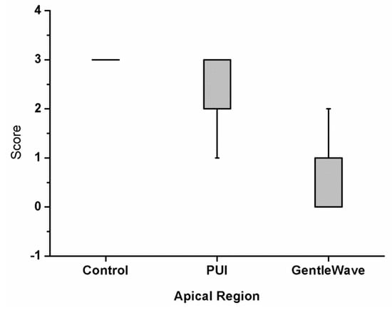 The results of the analysis of biofilm removal from the apical-third regions are summarized in Figure 6. Group 1 contained large biofilm along the canal wall and inside the main canal. Group 3 had the lowest scores compared with Group 2 and Group 1. In the main canal and isthmus regions, the differences between Group 3 and Group 2 was statistically significant (p = 0.003 and p < 0.0001, respectively). The results of this study indicate that Group 3 disinfects significantly greater than Group 2.