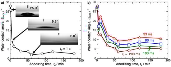 The pretreatment specimens were anodized in pyrophosphoric acid at 80 V and 283 K for up to 180 min. Figure 1a shows the change in the water contact angle measured on the aluminum specimen, θWCA, with the anodizing time, ta. Here, the θWCA values were measured at td = 1 s after the 0.5 μL water droplet was placed on the surface. The electropolished aluminum surface exhibited hydrophilicity measuring θWCA = 25.9° due to the formation of a hydrophilic, thin native oxide film after electropolishing []. As the electropolished specimen was anodized for 5 min, a superhydrophilic surface measuring θWCA = 9.8° was successfully obtained due to the formation of anodic aluminum oxide. The θWCA then gradually decreased with increasing anodizing time, and lower contact angles measuring 2°–4° were obtained after anodizing for 30–180 min. Notably, the minimum contact angle measuring 2.0° was obtained on the surface anodized for 60 min, and it appears that the contact angle very slightly increased with the anodizing time, although it is difficult to conclude a significant difference based on these small values. Therefore, the contact angles were also measured at the early stages after the droplet was placed on the surface using a high-speed CCD camera.