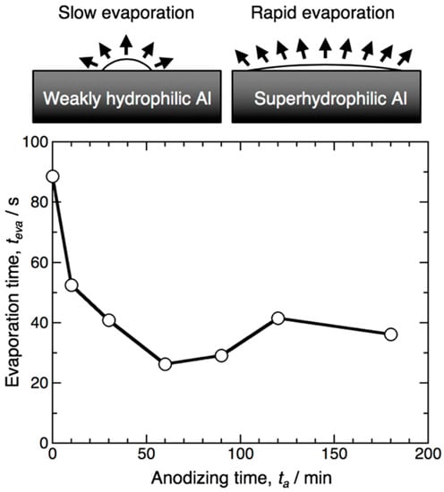 Change in the evaporation time of a 0.5 μL water droplet, teva, with the anodizing time, ta, on the aluminum specimen anodized at 283 K and 80 V. The temperature of the aluminum substrate was maintained at 313 K using a thermoelectric Peltier module.