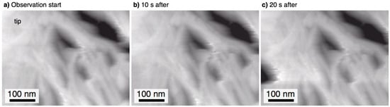 When the water droplet is placed on the aluminum surface covered with the pyramidal alumina bundle structures, one question is whether or not the shape of the bundles is maintained in water. To reveal the morphology of the alumina bundle structures in ultrapure water, the specimen anodized for 60 min was examined by in situ HS-AFM. Figure 4a shows a HS-AFM image of a bundle structure formed by anodizing in pyrophosphoric acid at 293 K and 75 V for 15 min. It is clear that the bundle structures consisting of many alumina nanofibers maintained their shape in ultrapure water; the alumina nanofibers were not separated and fluttered in the underwater conditions. Figure 4b,c show HS-AFM images of the bundle structure at 10 s and 20 s after starting the observation, respectively. Although several nanofibers were slightly moved by the scanning of the cantilever, the shape of the bundle structure and the alumina nanofibers was largely maintained during in situ HS-AFM observation for 20 s. Therefore, it is expected that the bundle structures maintained their shapes in water when the water droplet was placed on the anodized surface during the contact angle measurements. The reason that the bundle structures were unchanged in water may be due to the van der Waals forces between the alumina nanofibers [].