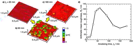Figure 5a–c depict three-dimensional AFM images of a specimen anodized in pyrophosphoric acid at 283 K and 80 V for (a) ta = 20 min, (b) 60 min, and (c) 180 min, respectively. As the aluminum specimen was anodized for 20 min, a porous oxide film was formed on the surface (Figure 3a), and a relatively flat surface with numerous small nanopores was observed in the AFM image (Figure 5a). As the anodizing time increased to 60 min, many convex bundle structures of approximately 1 μm in maximum height were observed to be distributed on the surface (Figure 3c and Figure 5b). However, further anodizing for 180 min caused the disappearance of the bundle structures due to the complete bending of longer alumina nanofibers, and the surface roughness decreased (Figure 3d and Figure 5c). Figure 5d summarizes the change in the arithmetic mean roughness measured from the AFM image, Ra, with the anodizing time. The roughness rapidly increased with the anodizing time during the initial stage due to the formation of alumina nanofibers and subsequent bundle structures, and a maximum roughness measuring Ra = 124 nm was obtained by anodizing for 60 min. With this anodizing time, the highest superhydrophilicity was exhibited on the aluminum surface (Figure 1 and Figure 2). The roughness, then, gradually decreased to approximately 50 nm due to the bending of alumina nanofibers by excess anodizing. The water contact angle measured at this stage increased with the anodizing time. As compared the contact angle investigations with the surface roughness, the water contact angle and hydrophilic behavior clearly depend on the surface roughness.