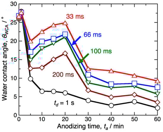 Figure 1b shows the θWCA − ta curves obtained at td = 200, 100, 66, and 33 ms after the 0.5 μL water droplet was placed on the surface. Although similar tendencies were obtained at td = 200 ms through 33 ms, the contact angles obtained at each anodizing time decreased with increasing td value. The minimum contact angle was measured at ta = 60 min in either case except for 66 ms, and superhydrophilicity, with a contact angle measuring θWCA = 9.2°, was exhibited on the surface anodized for ta = 60 min within only 33 ms after the water placement.