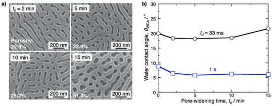 To understand the effect of pore diameter in the porous alumina film on the contact angle, contact angle measurements were also performed using pore-widening porous alumina specimens. Here, the electropolished aluminum specimens were anodized in pyrophosphoric acid at 283 K and 80 V for 5 min to form a porous alumina film, and the anodized specimens were then immersed in a 0.52 M phosphoric acid solution at 293 K for up to tp = 15 min for pore-widening. Figure 8a shows SEM images of the surface of the anodized specimen after pore-widening. Circular pores and linear trenches were formed on the surface by pore-widening for 2 min, and the porosity was calculated to be 22.8% using image analysis software. Although the porosity of the porous alumina was almost unchanged in a short immersion time for tp = 5 min, it gradually increased with immersion time by long-term pore-widening (25.2% for 10 min and 31.4% for 15 min). The porous alumina film was completely dissolved into the solution by immersion for 20 min. Figure 8b shows the θWCA − tp curves obtained on the anodized specimens after pore-widening. At td = 1 s, the contact angle slightly decreased during the initial stage of pore-widening and then was almost unchanged during pore-widening. Conversely, it is clear that the contact angle obtained at td = 33 ms gradually increased with the pore-widening time and corresponding the porosity. Based on Figure 6 and Figure 8, the porosity—in other words, the diameter of the pores formed in the porous alumina film—strongly affects the contact angle obtained at the initial stage after the droplet is placed on the surface, and the contact angle increases with the pore diameter.