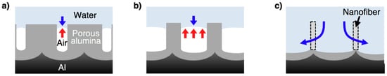 Schematic illustrations of the cross-section of the anodized specimen after the water droplet was placed on the surface: (a) porous alumina with narrow pores, (b) porous alumina with large-scale pores, and (c) nanofiber-covered surface.