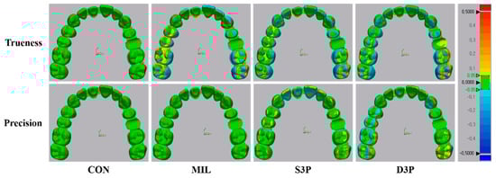 - Kim, S.Y.; Shin, Y.S.; Jung, H.D.; Hwang, C.J.; Baik, H.S.; Cha, J.Y. Precision and trueness of dental models manufactured with different 3-dimensional printing techniques. Am. J. Orthod. Dentofac. Orthop. 2018, 153, 144–153. [Google Scholar] [CrossRef]