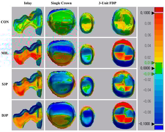 - Schaefer, O.; Schmidt, M.; Goebel, R.; Kuepper, H. Qualitative and quantitative three-dimensional accuracy of a single tooth captured by elastomeric impression materials: An in vitro study. J. Prosthet. Dent. 2012, 108, 165–172. [Google Scholar] [CrossRef]