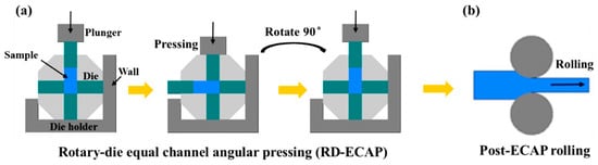 Processing schematic of (a) RD-ECAP and (b) post-ECAP rolling.