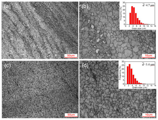 Figure 3 shows the optical micrographs of the C-ECAP and H-ECAP samples. After the ECAP processing, the grain sizes of α-Mg are remarkably refined and homogenized in both samples as dynamic recrystallization (DRX) occur during the pressing. Interestingly, the grain sizes in these two samples are comparable, while the overall microstructures are not the same. Figure 3a,b show that both the α-Mg matrix and the coarse β-Mg17Al12 phases in the as-cast sample (i.e., C sample) are remarkably refined and homogenized after 16 passes of RD-ECAP processing (i.e., C-ECAP sample). The original coarse β-Mg17Al12 networks in Figure 2a are reformed into finer banding distributions in Figure 3a, which highlights the shear deformation flow line of the RD-ECAP processing. As shown in Figure 3b, the matrix grains are refined to sizes ranging from ~2 μm to ~10 μm with an average size value of ~4.7 μm; finer second phases dispersed between the matrix grains in the banding areas. In addition to the difference of the overall structure described above, it also can be detected that the proportion of β-Mg17Al12 phases in the C-ECAP sample is lower than that in the C sample, which implies solid solution occurred during the RD-ECAP processing. The H-ECAP sample shows a different microstructure from C-ECAP sample, as shown in Figure 3c,d. A more refined and homogenized structure is formed in the H-ECAP alloy. Most grains are refined to sizes ranging from ~1μm to ~8 μm, with an average size value ~3.4 μm, as shown in Figure 3d. Tiny second phases can be carefully detected around the grain boundaries in the whole version in Figure 3d, implying second phase precipitation happened during the RD-ECAP processing.