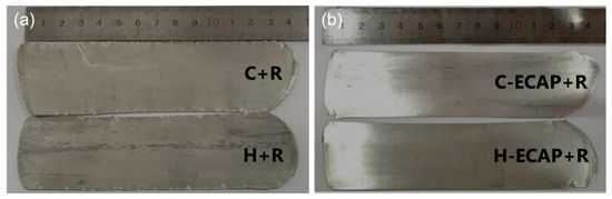 Macroscopic views of (a) C + R and H + R rolled alloys; (b) C-ECAP + R and H-ECAP + R AZ91 rolled alloys.