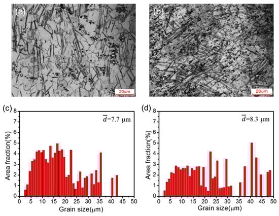 Figure 6 shows the optical microstructure and the grain area distributions of the C-ECAP + R and H-ECAP + R rolled alloys. It can be seen that the post-ECAP rolling contributed to heterogeneous microstructures with large amount twins and shear bands in both samples. The fine grains yield from ECAP processing illustrated in Figure 3 and Figure 4 are reformed into coarse ones with wide grain size ranges, as shown in Figure 6c,d. The average grain size of C-ECAP + R and H-ECAP + R sample is increased to ~7.7 μm and ~8.3 μm, respectively. These grain sizes are listed in Table 2 and compared with those of the C, H, C-ECAP and H-ECAP samples. The grain sizes of the C-ECAP + R and H-ECAP + R rolled alloys are coarsen a little bit compared to those of the C-ECAP (~4.7 μm) and H-ECAP (~3.4 μm) alloys, while they are significantly refined compared to those of the C (~100 μm) and H (~220 μm) samples. Apart from the grain size change, different changes happened in the amount and morphology of β-Mg17Al12 phases after the post-ECAP rolling. Compare to the C-ECAP sample (Figure 3a,b), smaller amount of fine second phase particles remain in the C-ECAP + R sample (Figure 6a), and the remained second phases have a distribution tendency along the rolling direction, while compared to the H-ECAP sample (Figure 3c,d), the β-Mg17Al12 phases are coarsened and accumulated in the H-ECAP + R sample (Figure 6b) and have no obvious distribution tendency.