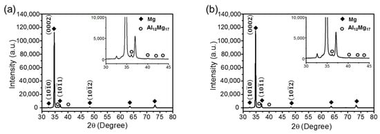 XRD patterns of (a) C-ECAP+R and (b) H-ECAP+R AZ91 rolled alloys.