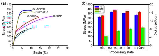 Figure 8 shows the typical tensile stress-strain results of AZ91 alloys after different processing states. As shown in Figure 8a, the C and H samples show relatively poor mechanical properties with ultimate tensile strengths (UST) under 200 MPa and strain less than 6% and 10%, respectively. After 16 passes of ECAP, the UTS and ductility increase remarkably in both ECAP-ed alloys, i.e., the C-ECAP and H-ECAP samples. The UTS of the C-ECAP and H-ECAP sample increase to 307 MPa and 322 MPa, respectively; the elongations (EL) increase to ~11.5% and ~19.6%, respectively. These present results demonstrate that the as-homogenized alloy yields more excellent mechanical properties than the as-cast alloy when subjected to RD-ECAP processing in this work. However, despite the improvement in the UTS and EL, the yield strengths (YS) are still low in both ECAP-ed alloys (<200 MPa). After post-ECAP rolling process, both of the UTS and YS are remarkably increased in these two rolled alloys, i.e., the C-ECAP + R and H-ECAP + R samples, of which the UTS are increased to 386 MPa and 366 MPa, respectively; and the YS are increased to 370 MPa and 337 MPa, respectively. In addition to the increased UTS and YS, the rolled alloys possess moderate ductility with elongation of ~7.2% and ~8.8%, respectively, which resemble the findings obtained by other researchers [41,42]. Indeed, some evidence on moderate elongation can also be found in Figure 5. The specimens of C-ECAP + R and H-ECAP + R in conjunction with the macroscopic views in Figure 5 have smooth surfaces and a few edge cracks, which leads to better plastic deformation and ductility.