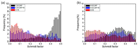 Schmidt factor statistics of (a) C-ECAP, C-ECAP + R and C + R alloys; (b) H-ECAP, H-ECAP + R and H + R alloys.