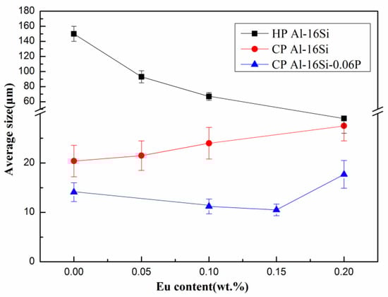 Figure 1e–h describe the SEM micrographs of the CP Al–16Si alloys with different Eu contents. Compared to the unmodified HP Al–16Si alloy, it was found that the primary Si crystals were greatly refined due to the presence of the P impurity element in the unmodified CP Al–16Si alloy, but the plate–like eutectic Si became thicker. Although the plate–to–fibrous transformation of eutectic Si was also found in CP Al–16Si alloys, the primary Si particles gradually became larger as the Eu content increased, as shown in Figure 2. In particular, when the Eu addition was 0.2%, the primary Si particles were much coarser (Figure 1h). The mutual poisoning between Eu and P in hypoeutectic Al–Si alloys was reported in our previous work [], where the coarse Al2Si2Eu phase was believed to react with AlP. Moreover, the EuP phase was also expected to be preferentially formed []. Hence, the coarsening of primary Si in Eu–modified CP Al–16Si alloys appears to be caused by the depletion and poisoning of pre–existing AlP impurities in the melt. The results show that Eu cannot simultaneously refine the primary Si and modify the eutectic Si in the CP Al–16Si alloy.