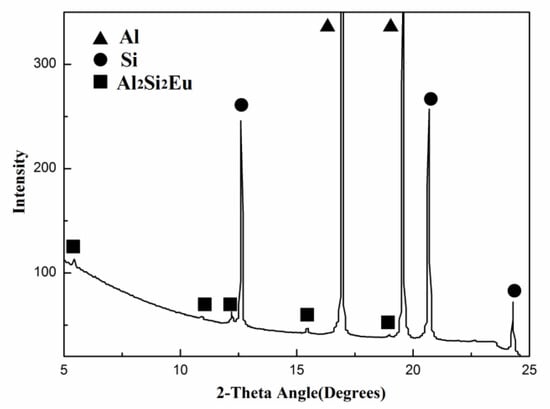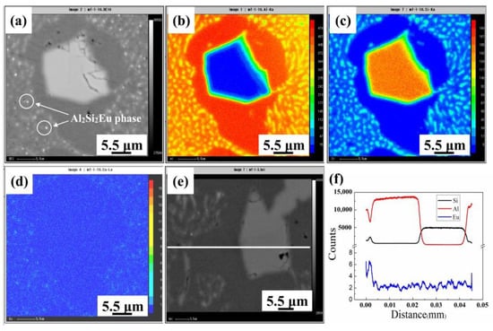 For purpose of elucidating the Eu distribution in the microstructure, Figure 5 presents the micro x–ray diffraction (μ–XRD) pattern for the HP Al–16Si–0.2Eu alloy, confirming the existence of the Al2Si2Eu phase together with Al and Si. The overall distribution of Eu in the HP Al–16Si–0.2Eu alloy was easy to distinguish in the back scattered electron (BSE) image with a much brighter contrast in the microstructure, where the small Al2Si2Eu phase was frequently observed in the eutectic mixture, as demonstrated in Figure 6a. The electron probe microanalysis (EPMA) mappings in Figure 6b–d show that no distinct enrichment of Eu was observed within primary Si, and Eu was mainly distributed in the eutectic mixture, which corresponded well to the small Al2Si2Eu phase in Figure 6a. It was further supported by using the EPMA line analysis in Figure 6e,f, indicating that the Eu concentration in eutectic Si was much higher than primary Si.