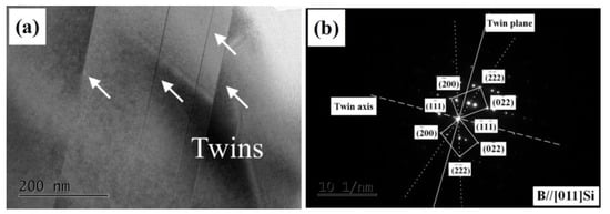 However, unlike eutectic Si, the Eu element did not greatly partition into the primary Si and surrounding Al dendrites in Figure 6d. Compared to the modified eutectic Si (Figure 7), fewer parallel twins, rather than multiple twins, were observed in primary Si in the HP Al–16Si–0.2Eu alloy, as shown in the TEM image of primary Si (Figure 8a) and the corresponding SADP (Figure 8b). Therefore, the refinement of primary Si in the HP Al–16Si–0.2Eu alloy is not caused by IIT and the poisoning of TPRE mechanisms. As Eu has exceedingly limited solid solubility in primary Si, the accumulation of Eu elements at the growing interface of primary Si will be formed due to the rejection of the Eu solute from the primary Si during the solidification process. Therefore, a constitutional undercooling was established, which restricted the growth of primary Si and refined them in the HP Al–16Si–0.2Eu alloy.