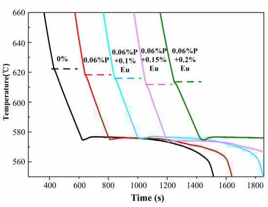 Figure 9 presents the measured cooling curves of unmodified and Eu–modified CP Al–16Si–0.06P alloys. Due to the existence of AlP impurities in CP Al–16Si alloys, the formation of primary Si appears in the cooling curves and the corresponding primary Si reaction temperatures are shown in Table 2. The primary Si reaction temperature was discovered to be reduced by the addition of 0.06% P, which agreed well with the research by Liu Y. et al. [], who pointed out that the cooling curves hardly indicated the nucleation of primary Si. The small volume fraction of primary Si results in the little released latent heat, which cannot alter the slope until very late after the nucleation of primary Si. Thus for primary Si, the slope variation responds more to growth than nucleation, and the depressed slope variation in the Al–16Si–0.06P alloy actually indicates the slow growth of primary Si restricted by AlP []. With the addition of 0.1% Eu and 0.15% Eu to the CP Al–16Si–0.06P alloys, the slope changes for primary Si were further reduced, indicating that the growth of primary Si is hindered by Eu. However, the primary Si reaction temperature began to increase with the addition of 0.2% Eu, which suggests that the refinement mechanism of primary Si changed in this situation.