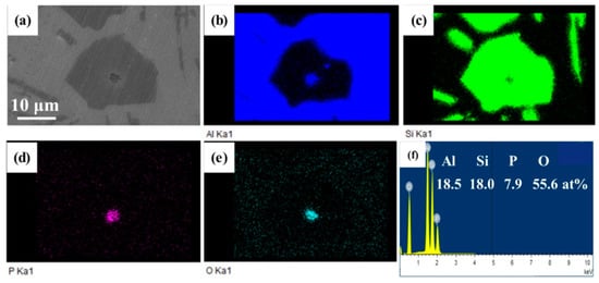 Energy dispersive x–ray spectroscopy (EDX) analysis of primary Si particles in the 0.15% Eu–modified CP Al–16Si–0.06P alloy: (a) SEM image; (b) Al; (c) Si; (d) P; (e) O, and (f) EDX point analysis of black particle in (a).