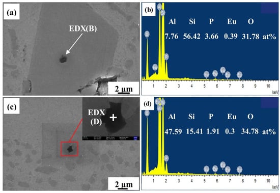 Figure 11 depicts the EDX analysis of a primary Si in the 0.2% Eu–modified Al–16Si–0.06P alloy. Aside from the prospective intensity signals for Al, P, and O, the presence of Eu was found in the nucleus of primary Si, as shown in Figure 11b. Meanwhile, few similar black particles containing Al, P, O, and Eu were also discovered in the eutectic mixture, as depicted in Figure 11c,d. However, there was no primary Si nucleating at these particles. This indicates that Eu may solubilize in AlP to form (Al, Eu)P compounds and weaken the ability of AlP as the heterogeneous nucleating substrate for primary Si, which is consistent with the results of the microstructures (Figure 1) and cooling curves (Figure 9).