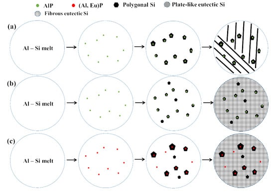 The possible solidification processes and refinement mechanisms of primary Si in CP Al–16Si–0.06P alloys with varying Eu content can be schematically illustrated in Figure 12.