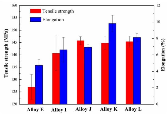where Di is the average length of diameters measured at 2 degree intervals and passing through the particle’s centroid; n is the number of particles of a single field; and m is the number of the fields. The micro x–ray diffraction (μ–XRD) was performed at beamline BL15U1 at the Shanghai Synchrotron Radiation Facility (SSRF) (Shanghai, China) and the correlative experimental details were described in our preceding paper []. The microstructures were characterized by scanning electron microscopy (SEM, Zeiss supra 55, Oberkochen, Germany) operated at 15 KV, electron probe microanalysis (EPMA–1600, Shimadzu, Kyoto, Japan) operated at 15 KV, and transmission electron microscopy (TEM, aberration–corrected FEI Titan G2 60–300, Hillsboro, OR, USA) operated at 200 kV. The tensile specimens were prepared as per the ASTME8M–04 standard with a gauge length of 30 mm and a gauge diameter of 6 mm. The tensile test was conducted with a strain rate of 1.25 × 10−3 s−1 at room temperature using a universal tensile testing machine (Instron 5500R, Canton, UK). The values of ultimate tensile strength (UTS) and elongation (EI) were calculated by the average of three tests for each alloy and the fracture surfaces of the alloys were also characterized by SEM.