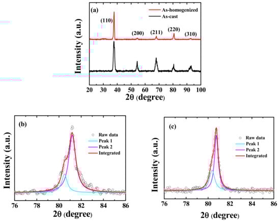 (a) The X-ray diffractometry (XRD) analysis of the as-cast and as-homogenized Ti25Zr25Nb25Ta25 alloys, (b) the enlargement of the (220) peak profile and the fitting curves for body-centered cubic (BCC)1 and BCC2 of the as-cast sample, and (c) the enlargement of the (220) peak profile.