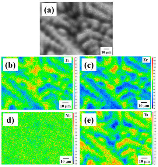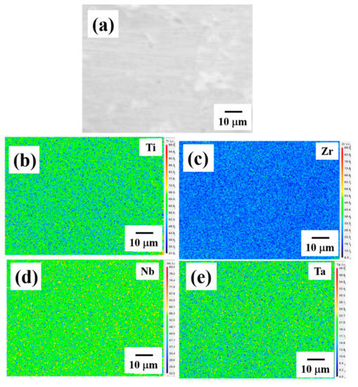 (a) The SEM BEI of the as-homogenized Ti25Zr25Nb25Ta25 HEA, and the corresponding composition mapping for (b) Ti, (c) Zr, (d) Nb, and (e) Ta.