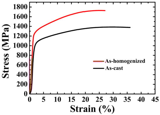 Cylindrical specimens with a diameter of 4 mm and a height of 8 mm for compression tests were machined from as-cast and as-homogenized samples. Compression tests at room temperature with a strain rate of 1 × 10−4 s−1 were conducted using the Instron 5582 universal testing machine (Norfolk County, MA, USA). To obtain accurate strains and strain rates, the Instron 2601 Linear Variable Differential Transformer (LVDT, Norfolk County, MA, USA) displacement transducer was employed for each specimen.