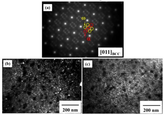 TEM results of the α and ω precipitates in the as-homogenized alloy: (a) SADP of the [012] BCC zone axis; (b) dark-field image taken from the α spot, as highlighted by the red circle in SADP; and (c) dark-field image taken from the ω spot, as highlighted by the yellow circle in SADP.