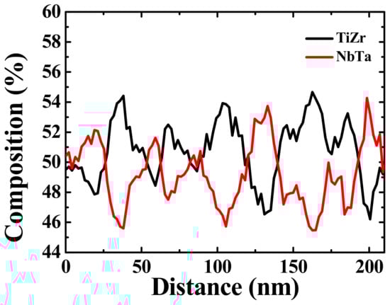 In order to characterize the structure further, TEM observation was carried out and the results are shown in Figure 6. The TEM dark-field image (Figure 6a) reveals a dual phase interconnected structure with a wavelength of about 20 nm inside the grains. Note that the inserted SADP shows that the as-homogenized alloy exhibits a BCC structure. Figure 6b presents the high-resolution TEM image and related fast Fourier transform (FFT) of the dual BCC phase interconnected structure. The (110) d-spacing of the spinodal region 1 (SP1) and spinodal region 2 (SP2) was measured to be 0.2389 and 0.2380 nm, respectively. As a result, the lattice mismatch between SP1 and SP2 is extremely small, demonstrating a coherent interface between them. A high-angle annular dark-field scanning transmission electron microscope (HAADF-STEM) image, as shown in Figure 6c, demonstrates that the spinodal structure consists of a dual phase with different Z-contrasts. The bright contrast region is the phase with a higher atomic number, Z, and the dark contrast region is the phase with a lower Z. Furthermore, the scanning transmission electron microscope energy dispersive X-ray spectroscopy (STEM-EDS) line scan was applied along the red line labeled in Figure 6c. The STEM-EDS line scan result of the spinodal structure is presented in Figure 7. Since the heat of mixing between Ti and Zr, as well as Nb and Ta, is 0 kJ/mol, these four elements were divided into a TiZr group and an NbTa group to present the apparent compositional fluctuation for the spinodal structure. TiZr is enriched in SP1 (dark contrast in Figure 6c), while NbTa is enriched in SP2 (bright contrast in Figure 6c). This may be attributed to the positive heat of mixing between TiNb, TiTa, ZrNb, and ZrTa, as listed in Table 1. The wavelength of the spinodal structure is about 20 nm on average, which is consistent with the results obtained by TEM observation. As aforementioned, with the homogenization process at 1100 °C, the DRs and IDs in the as-cast sample were well-dissolved in each other. During fast water quenching, the nano-scaled spinodal structure forms [28,29]. The spinodal decomposition spontaneously occurs and the diffusion process for coarsening will be limited by fast cooling [28]. Moreover, a spinodal structure with a wavelength of about 40–60 nm [30,31], which is very close to our results (about 20 nm), strengthens the alloys effectively, indicating the reason for such a good performance for the as-homogenized sample. In addition, it should be noted that both α and ω nano-precipitates can be observed within the grains, as shown in Figure 8. These two precipitates maintain a size that is similar to that in the as-cast alloy and distribute evenly within the grains, revealing that the precipitates are formed during the quenching [32]. Combining the mechanical property measurements and TEM observation, the spinodal interconnected structure is responsible for the strength increment.