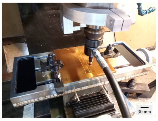 The dimensions of the workpiece used in this experiment are as follows: 100-mm width, 200-mm length, and 6.5-mm thickness; two sheets were used per experiment. The workpiece is securely fastened to the mechanical clamping device to prevent it from moving during the FSW process. FSW was done using the Bridgeport Computer Numerical Control (CNC) machine, model VMC500, as shown in Figure 1. The parameters used for the FSW process [25] are shown in Table 3.