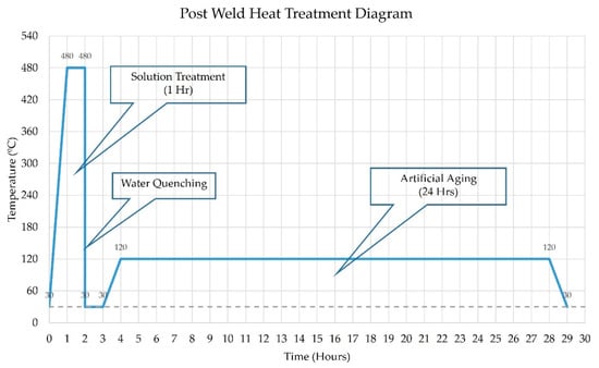 The PWHT process was undertaken to relax the residual stress that occurs after welding and, also, to improve the material’s mechanical properties at the design level. The effect of the PWHT process on the AA7075-T651 aluminum alloy FSW workpiece revealed that solution treatment (480 °C soaking for 1 h) followed by quenching with water and, then, an artificial aging cycle (120 °C soaking for 24 h), as shown in Figure 6, had the benefit of increasing the material’s tensile strength and hardness [17]. Accordingly, the conditions of such PWHT processes were used in this research.